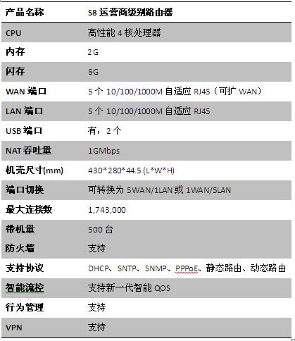 S8全千M运营商级别路由器,四核高性能处理器,适用500台左右机器的企业、网吧、小区用户,AP承载量128个,采用19寸铁盒,内置电源,2G内存,8G闪存,固态电容,防雷设计。