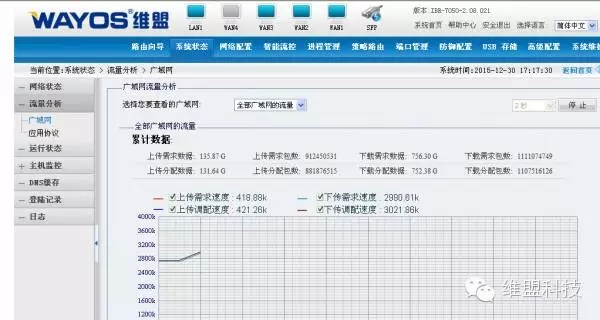 带宽情况:WAN1为电信30M专线,WAN2为联通50M专线,WAN3为电信100M家用线