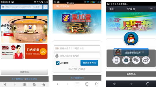 通过壹加壹平台自身架设,结合需求,采用会员卡号认证上网方式,导入会员卡号信息,实现卡号、密码方式认证上网(同时,支持手机号、微信公众账号二维码、QQ/微博账号等多方式认证上网),首页展示商场商品广告信息,后台预留用户上网记录;普通用户按时间段实现手机认证上网。