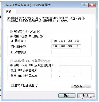 步骤一、把电脑接在防火墙ETH0接口,然后修改电脑的IP地址,因为防火墙默认是不开启DHCP功能的。ETH0出厂地址为10.254.254.254/24,电脑的地址应配置为10.254.254.0/24,但不允许为10.254.254.254;